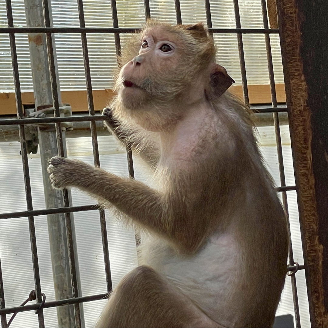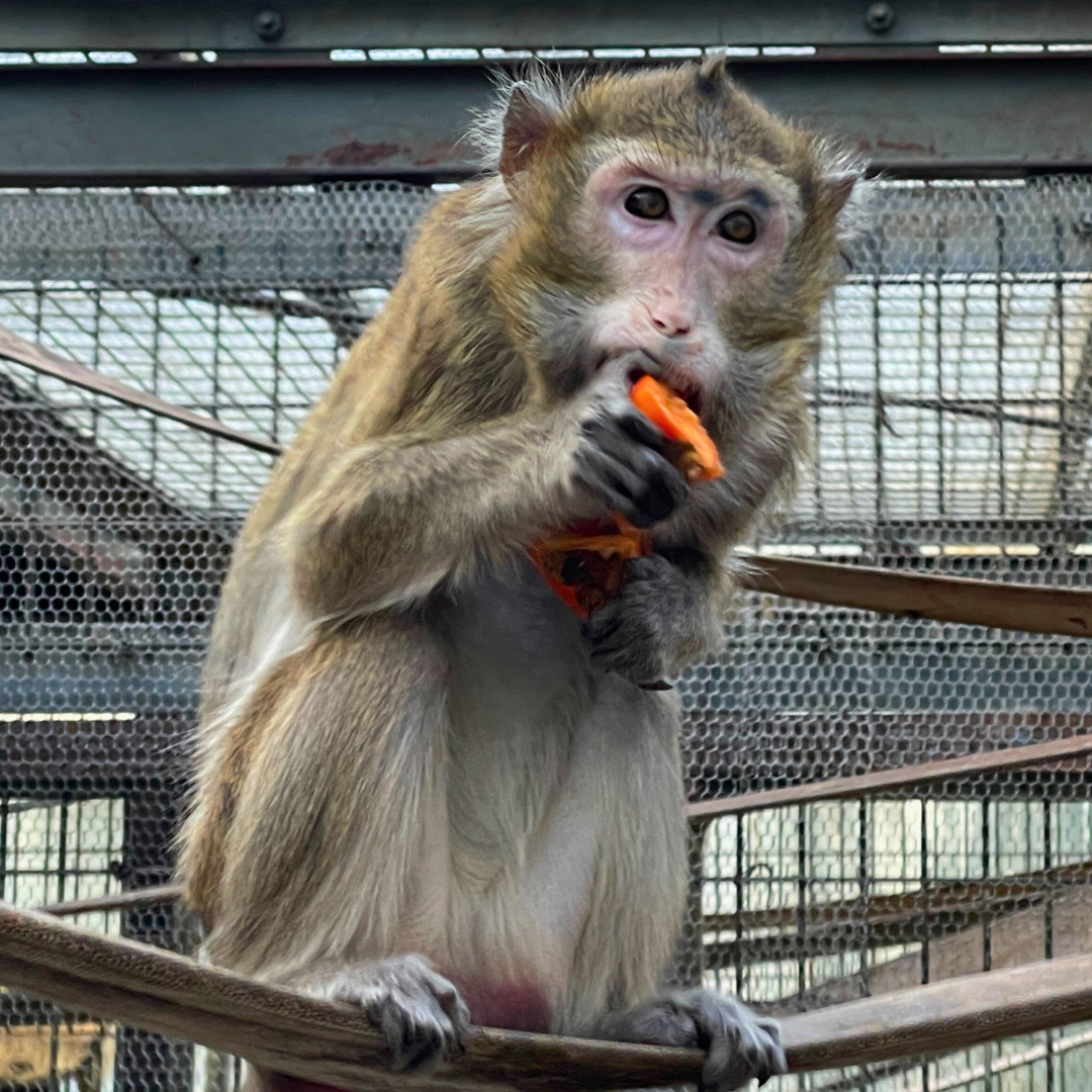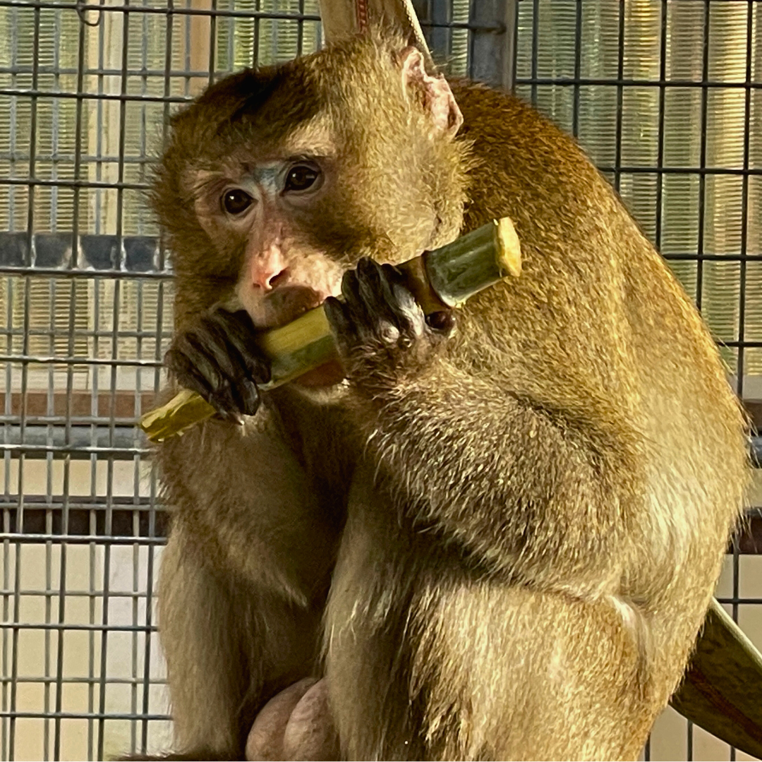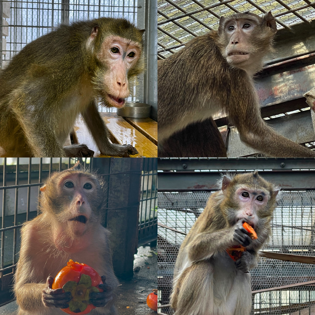 カニクイザルのバックヤードでは、びっくり元気なおじいちゃんやゴリゴリのオスたちをまとめる筋肉ムキムキのアルファオス、子煩悩な母ちゃんと気の強い娘など、個性さまざまな個体たちが毎日にぎやかに過ごしています。(*個体名は、モルゴ、モック、ジェン、イルカ、ベージュ、クログロ、ナイナイ、ニーナ、ジャスティ、イイヨ、イットウ、イーサン、サンバ、シルク、ゴウ、シャチ、マカロン)