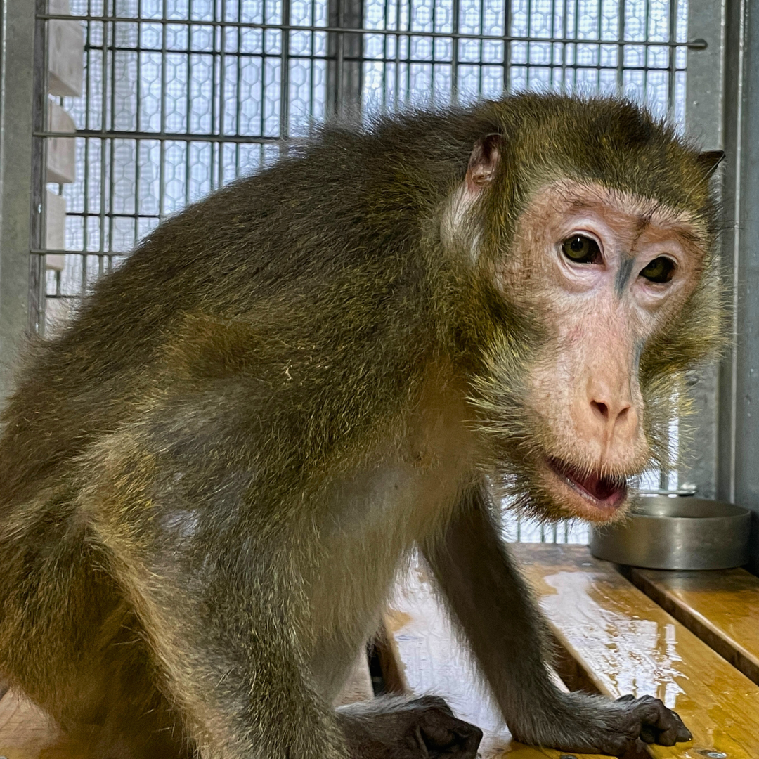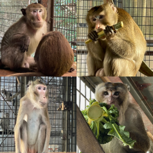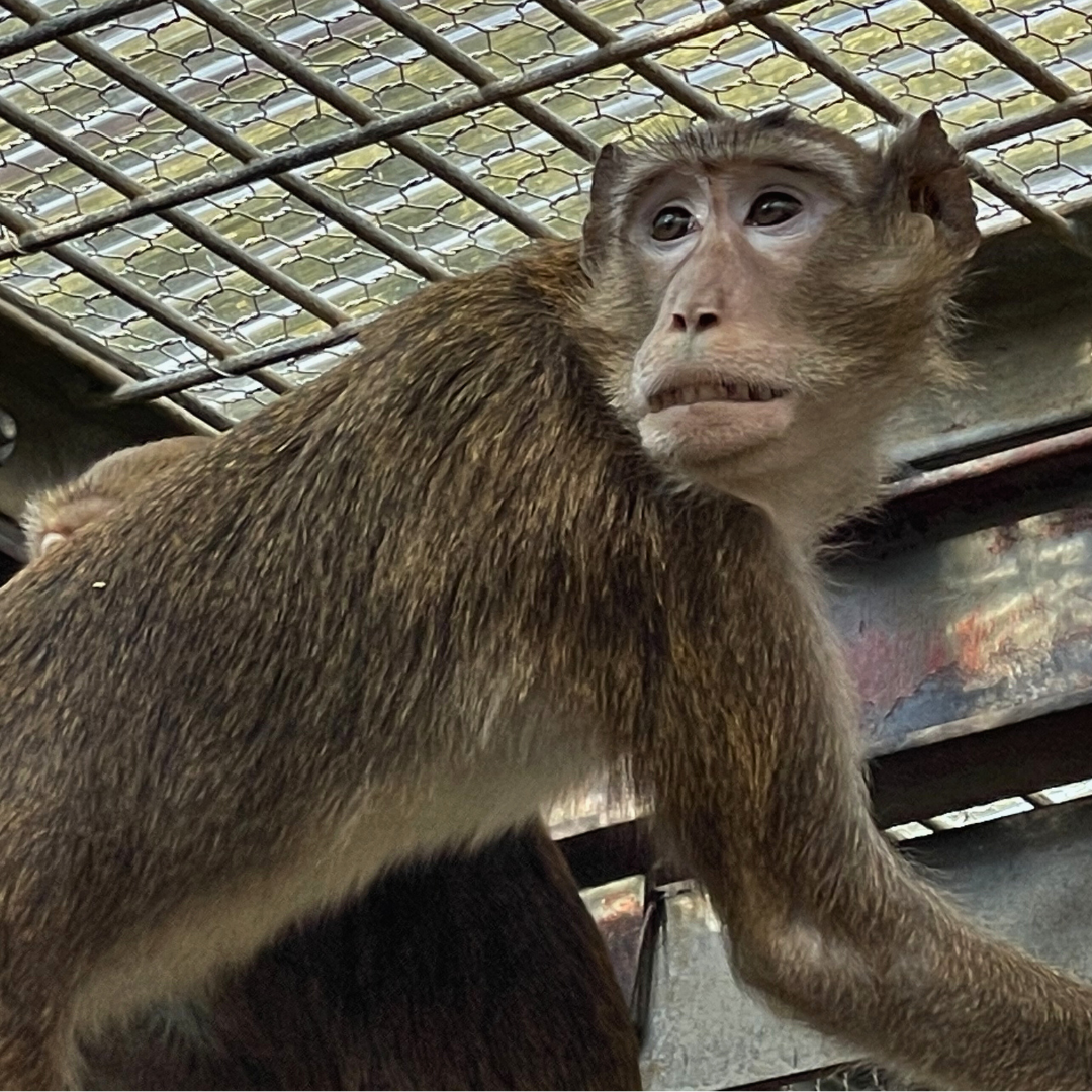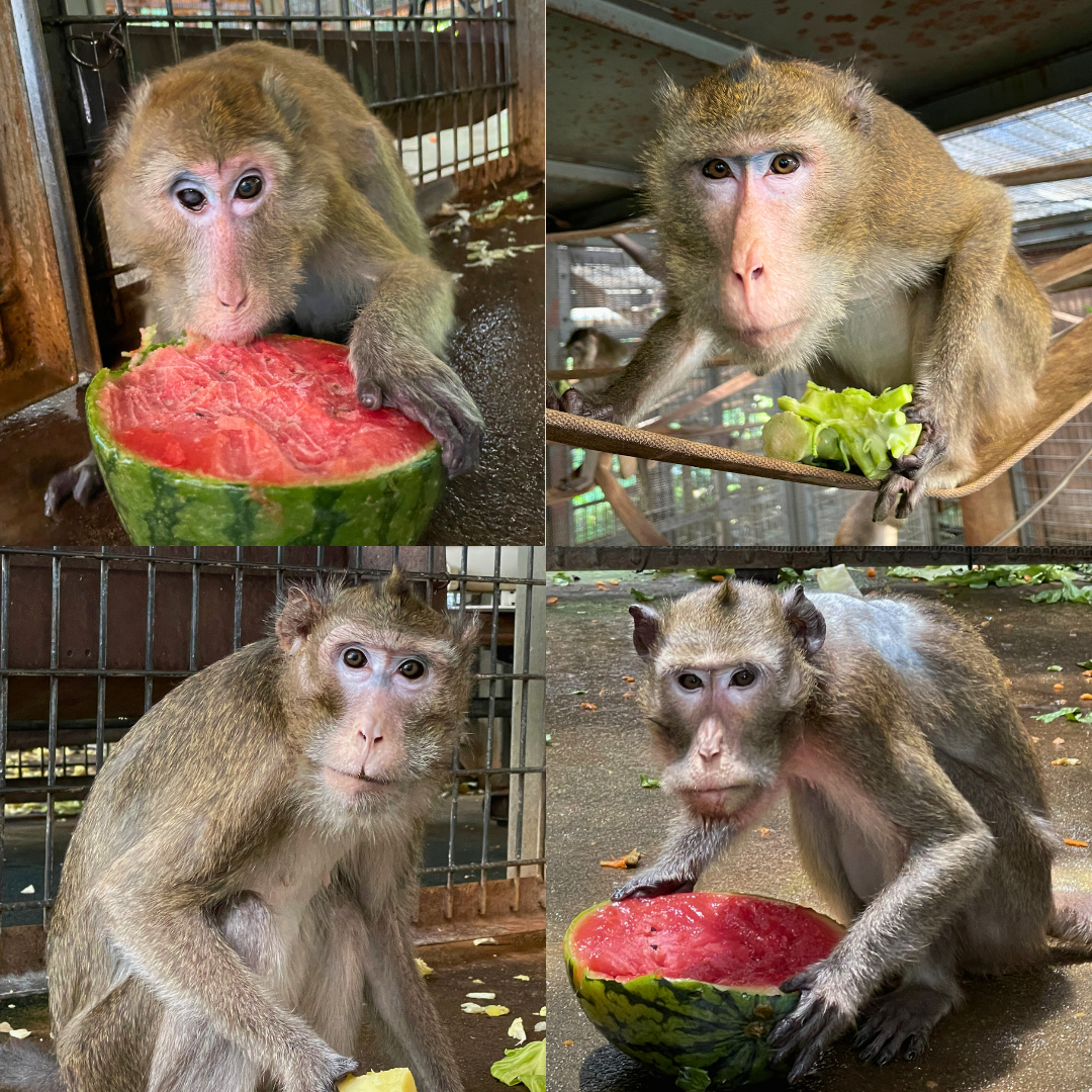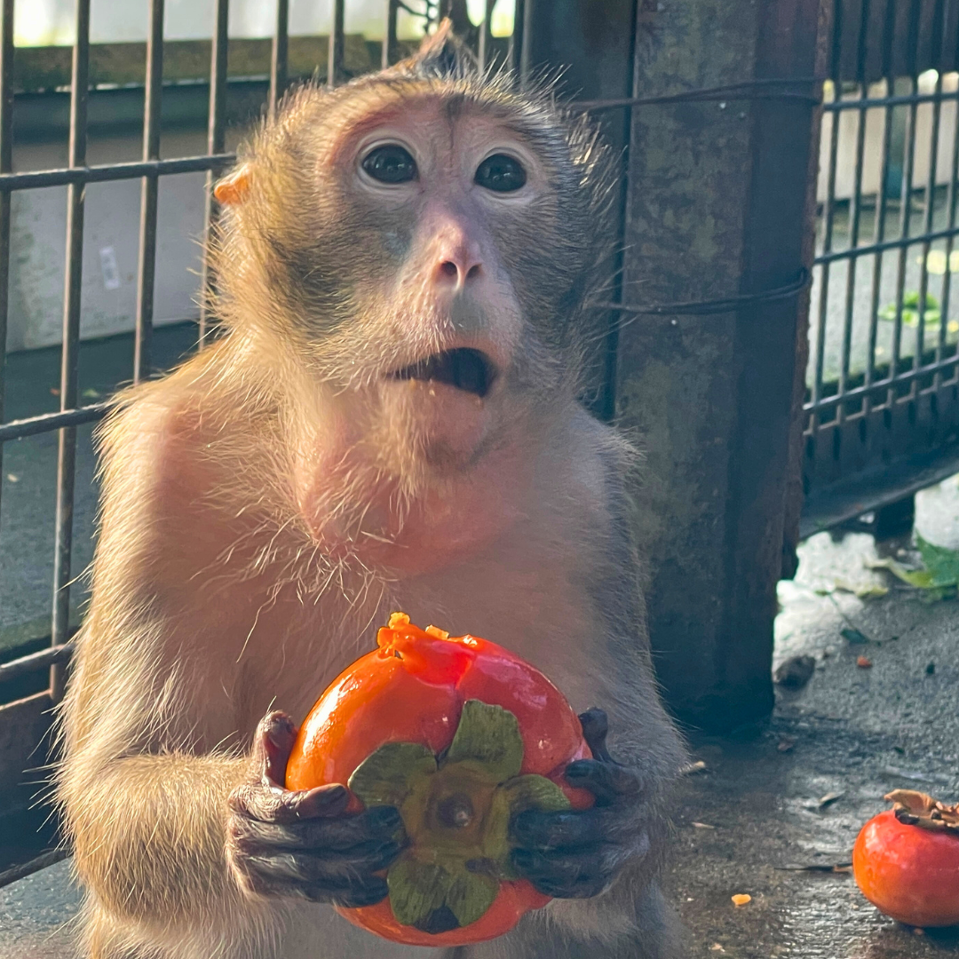 カニクイザルのバックヤードでは、びっくり元気なおじいちゃんやゴリゴリのオスたちをまとめる筋肉ムキムキのアルファオス、子煩悩な母ちゃんと気の強い娘など、個性さまざまな個体たちが毎日にぎやかに過ごしています。(*個体名は、モルゴ、モック、ジェン、イルカ、ベージュ、クログロ、ナイナイ、ニーナ、ジャスティ、イイヨ、イットウ、イーサン、サンバ、シルク、ゴウ、シャチ、マカロン)