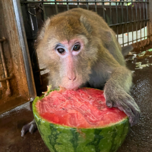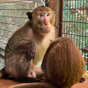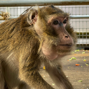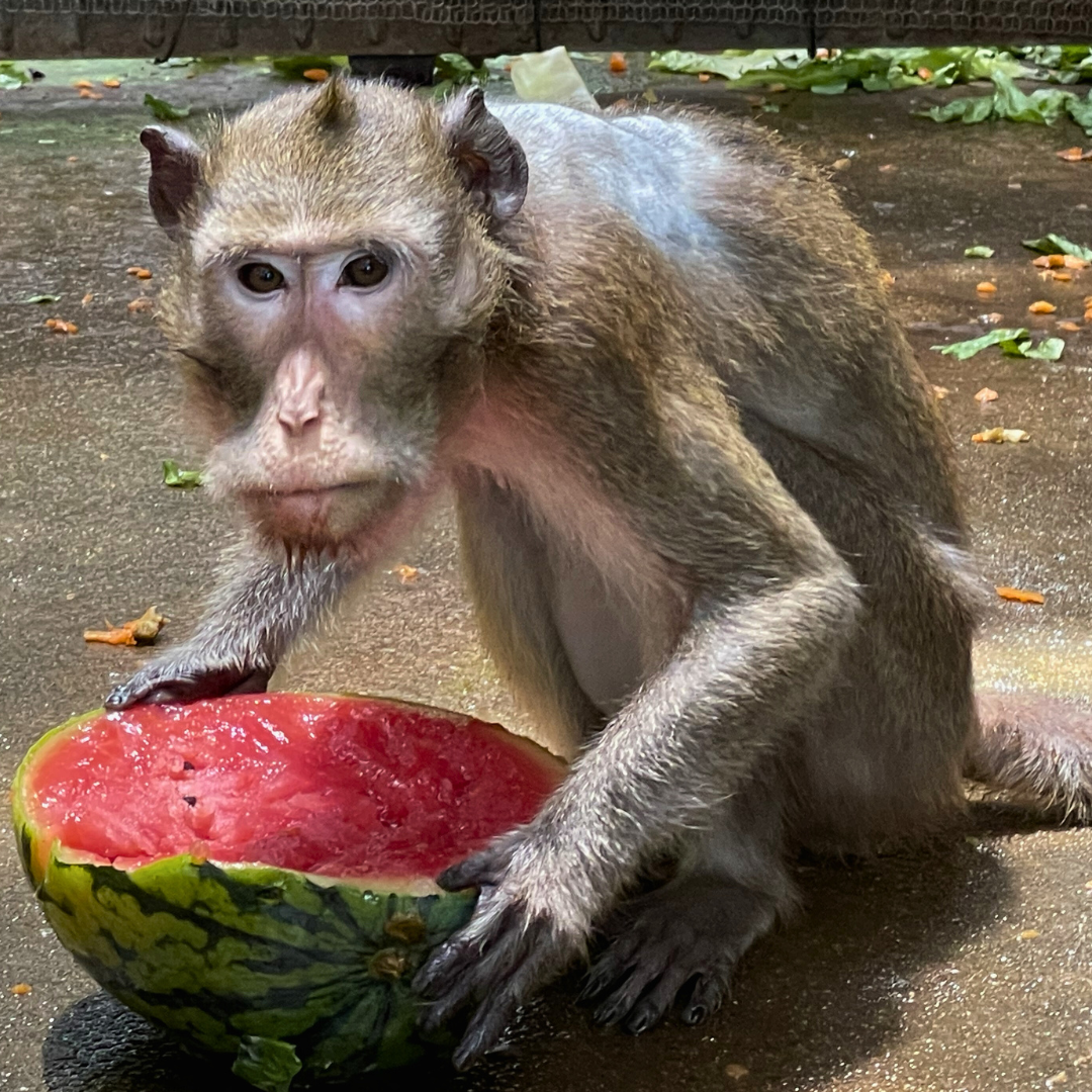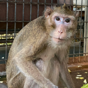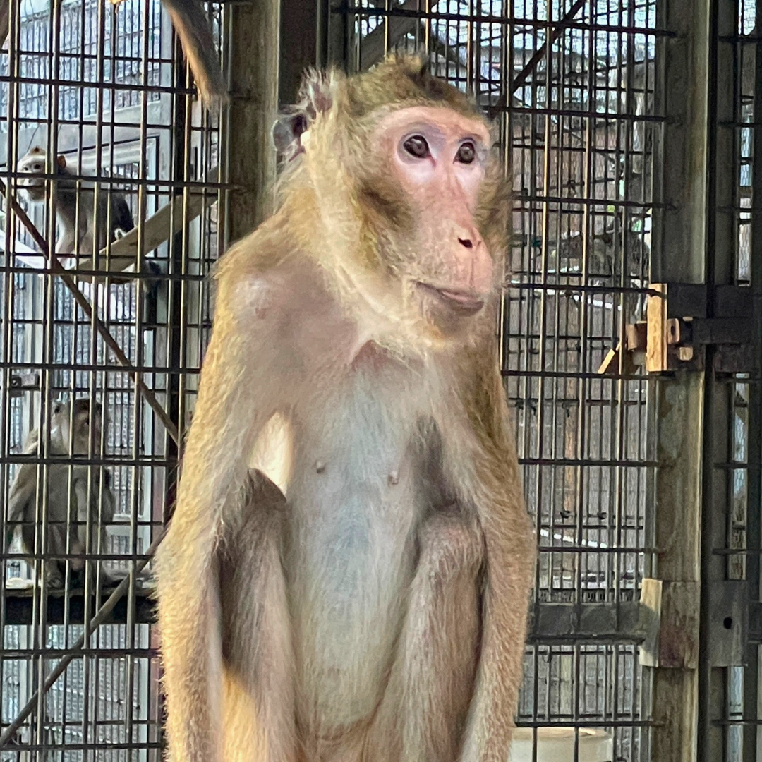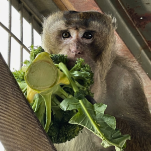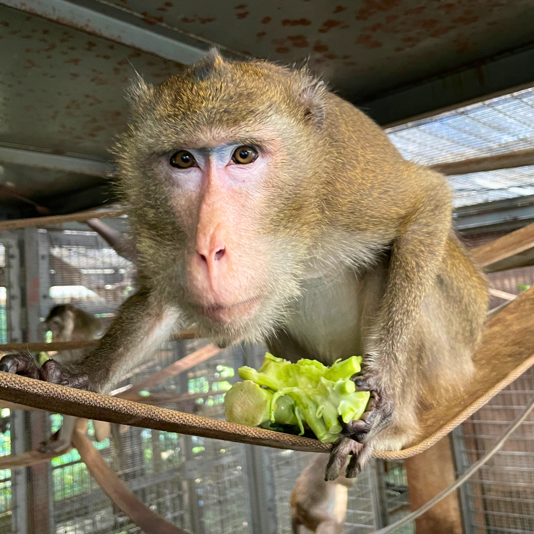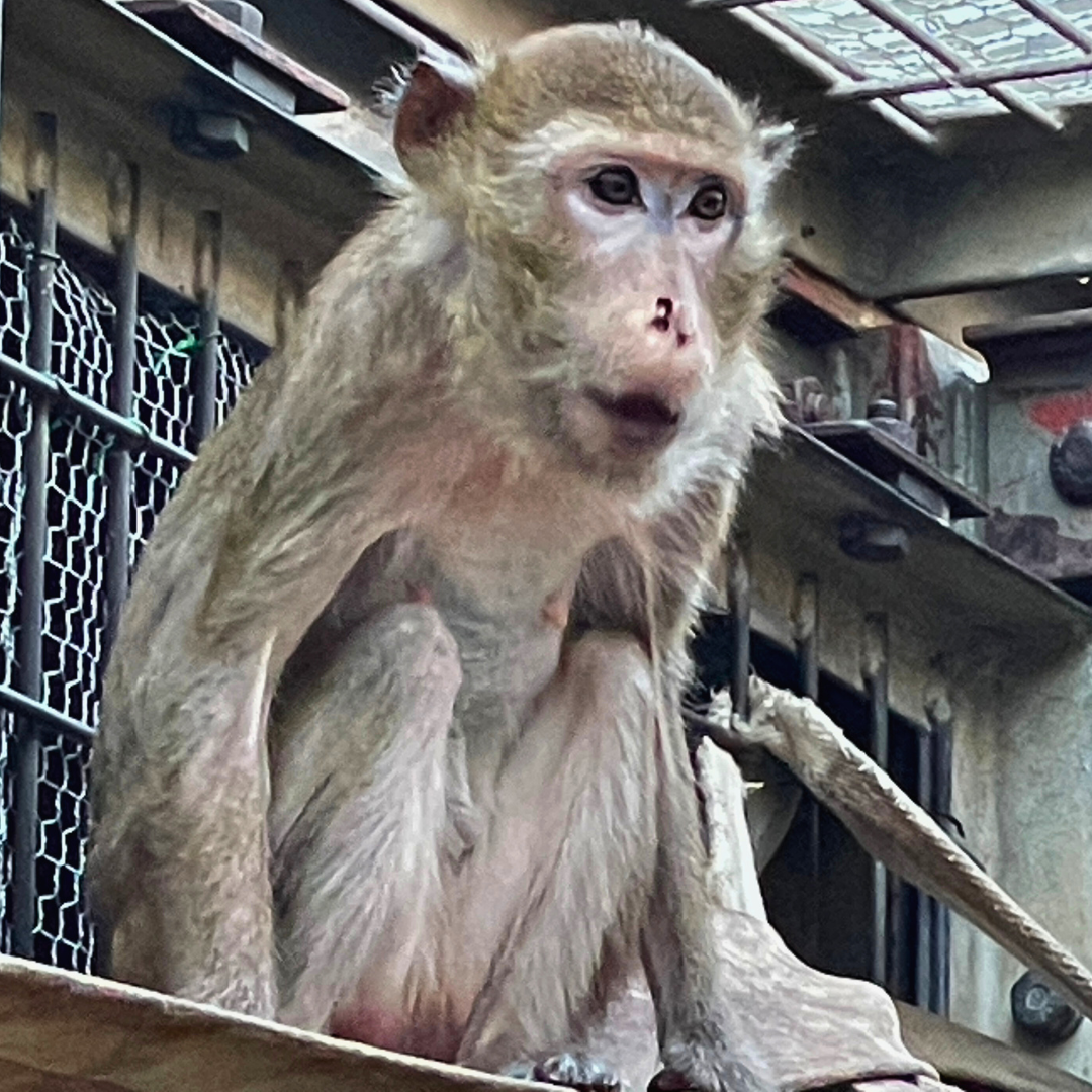 カニクイザルのバックヤードでは、びっくり元気なおじいちゃんやゴリゴリのオスたちをまとめる筋肉ムキムキのアルファオス、子煩悩な母ちゃんと気の強い娘など、個性さまざまな個体たちが毎日にぎやかに過ごしています。(*個体名は、モルゴ、モック、ジェン、イルカ、ベージュ、クログロ、ナイナイ、ニーナ、ジャスティ、イイヨ、イットウ、イーサン、サンバ、シルク、ゴウ、シャチ、マカロン)