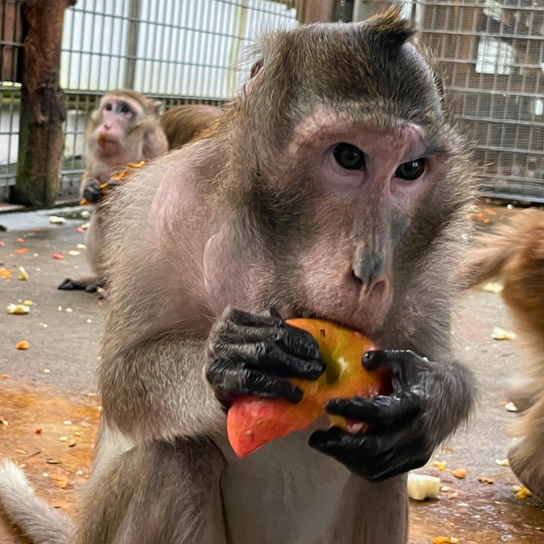 バックヤードにいるカニクイザルたちは、とても元気なおじいちゃんや、ゴリゴリのオスたちをまとめる筋肉ムキムキのアルファオス、子煩悩な母ちゃんと気の強い娘など、個性さまざまな個体たちが毎日にぎやかに過ごしています。(*個体名は、モルゴ、モック、ジェン、イルカ、ベージュ、クログロ、ナイナイ、ニーナ、ジャスティ、イイヨ、イットウ、イーサン、サンバ、シルク、ゴウ、シャチ、マカロン)