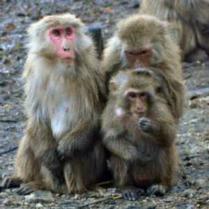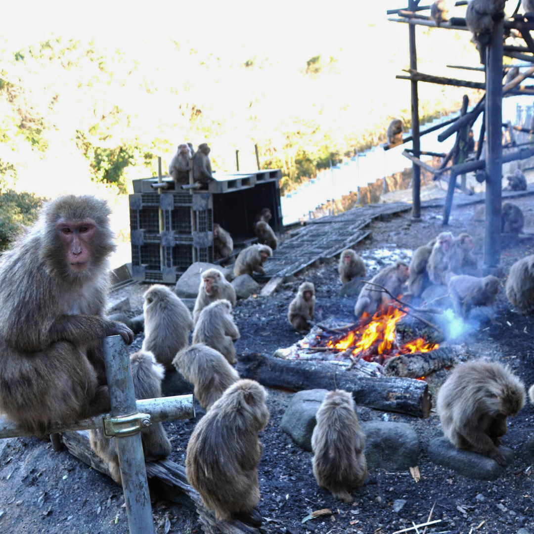 ヤクシマザルは、屋久島に生息するニホンザルの亜種です。日本モンキーセンターのモンキーバレイでは、約120頭のサルたちがのびのびと暮らしています。冬の風物詩の『たき火』では、火にあたりながら暖をとり、サツマイモを焼くこともあります!