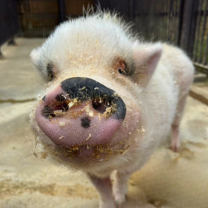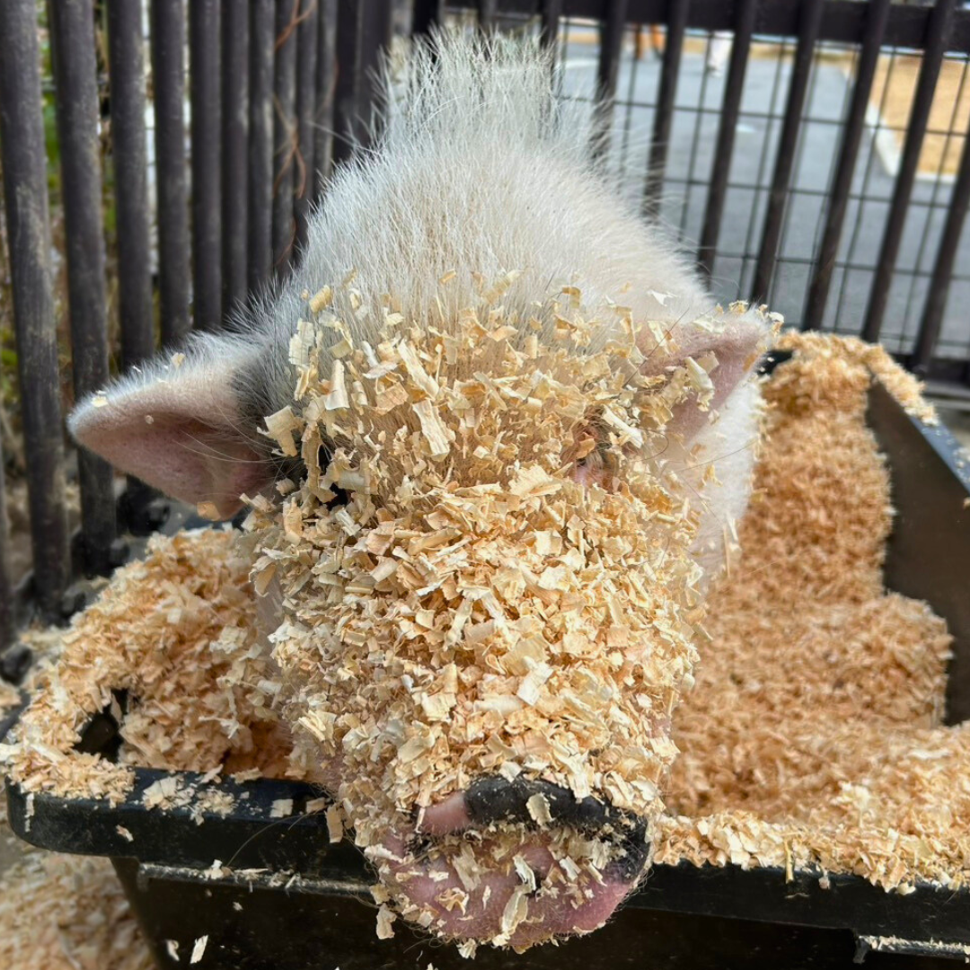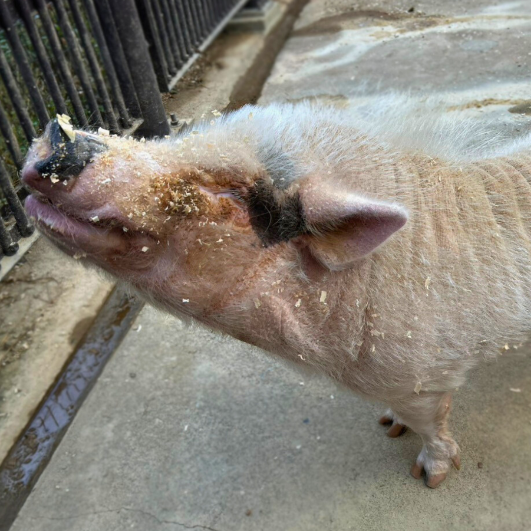 すこし臆病で、慎重な性格のピギィ。食いしん坊でリンゴが大好きです!大鋸(おが)の上で寝ている姿や、お腹をなでると気持ちよさそうに横になってもっと撫でてと甘えてくる姿に、日々癒されています。名前を呼ぶと、鳴いて寄ってくることもあります。