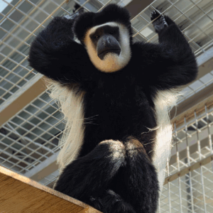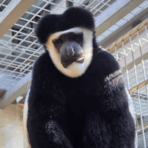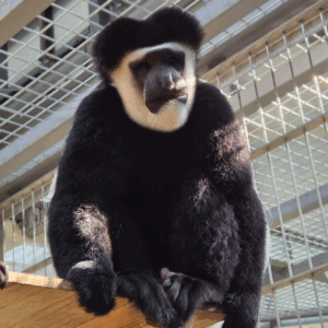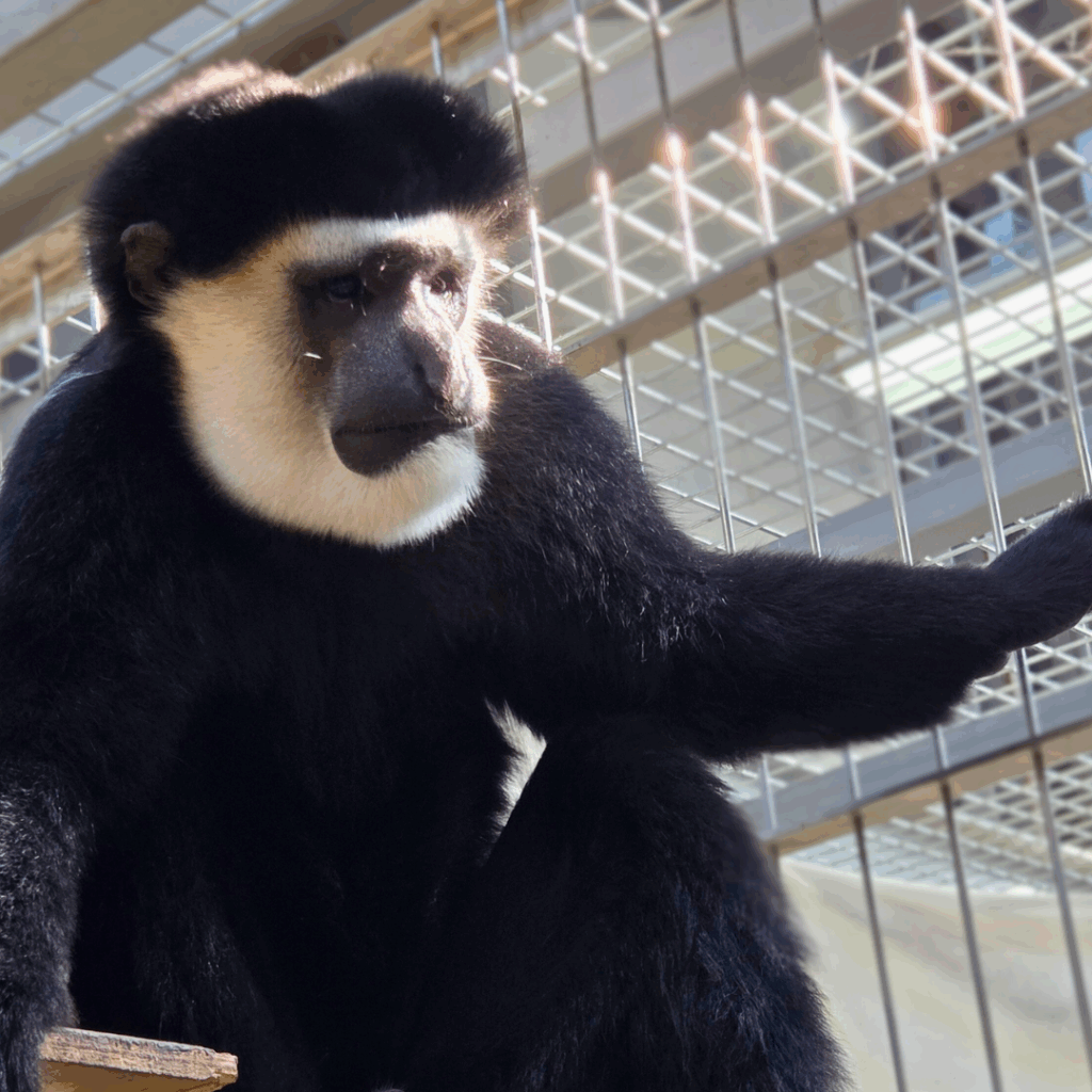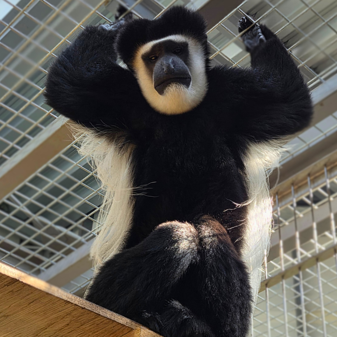 昨年生まれたイエモンとよく一緒に遊んでいるピンさん♪昨年と今年でめでたくこどもが生まれ、4頭のお父さんになりました!ピンさんのチャームポイントの一つでもある、アビシニアコロブスの頭の上の膨らみは筋肉で、それにより顎を強く動かし咀嚼することができます。