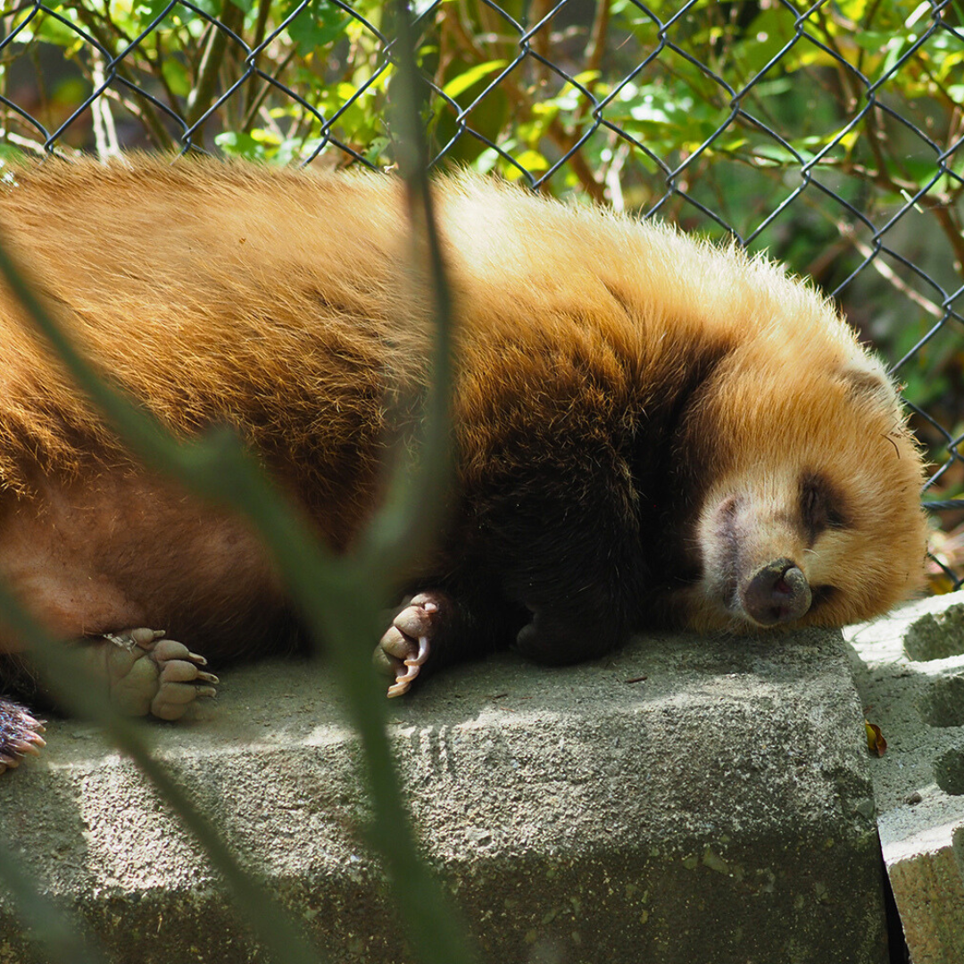 すごくマイペースでおっとりしています。マイペースすぎてエサに気づかなかったり、同じ展示場にいるジャジャにエサを取られるなど少しかわいそうですが見ていて微笑ましい所がたくさんあります。とても美人さんで愛くるしい表情をたくさん見せてくれます。