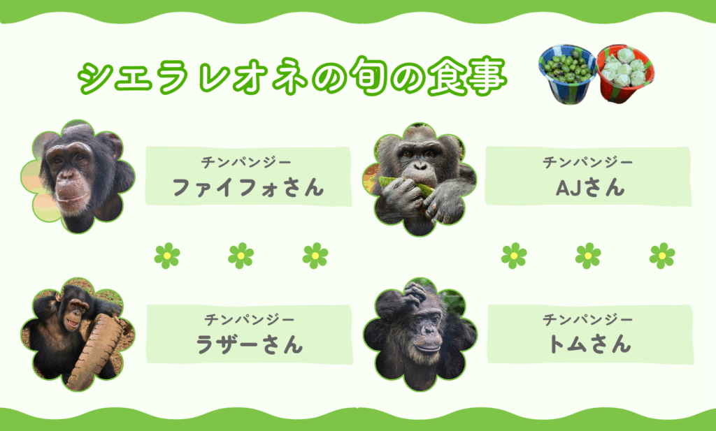 また、シエラレオネのタクガマ・チンパンジー・サンクチュアリで保護されたチンパンジーのラザーさん、トムさん、AJさん、ファイフォさんには、地元の旬の食事をプレゼントすることができます🇸🇱✨