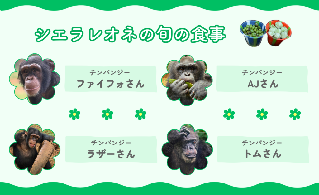 また、シエラレオネのタクガマ・チンパンジー・サンクチュアリで保護されたチンパンジーのラザーさん、トムさん、AJさん、ファイフォさんには、地元の旬の食事をプレゼントすることができます🇸🇱✨