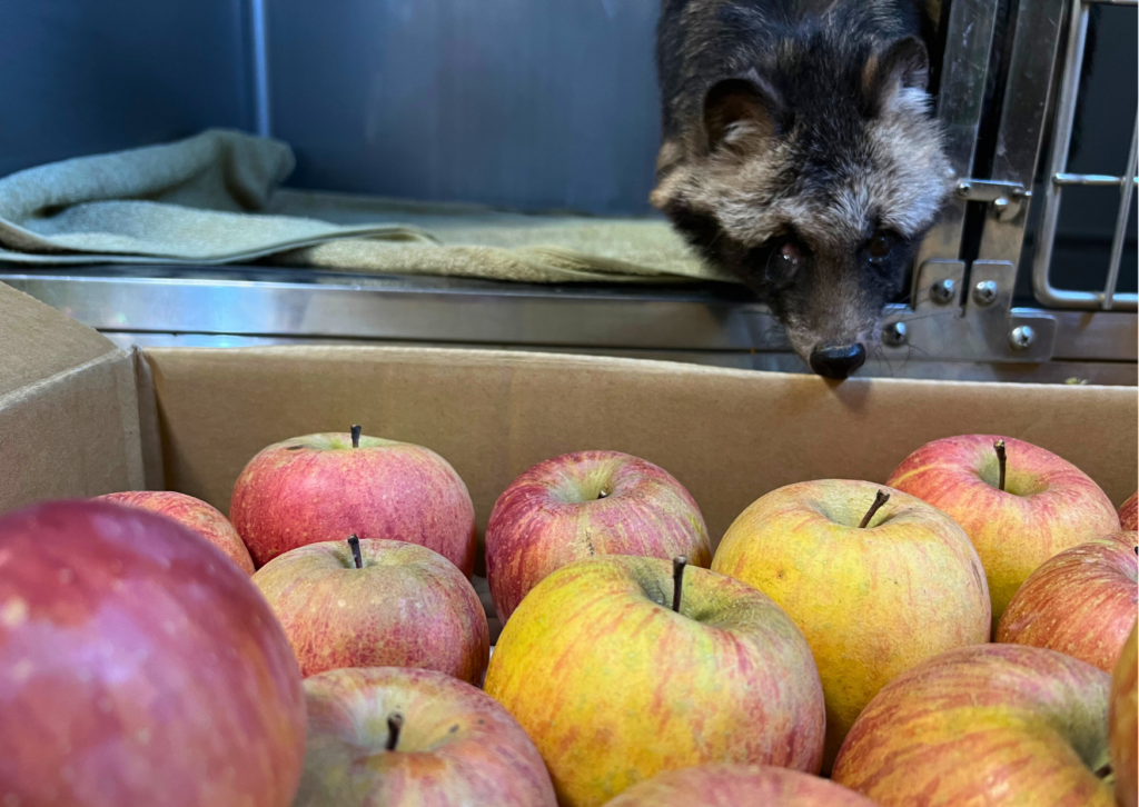 今回のお受け取り担当は、ホンドタヌキのヘレンさんです👏🍀お部屋でお寛ぎのところ、箱の中身が気になって出てきてくれました🤭🍎🍏