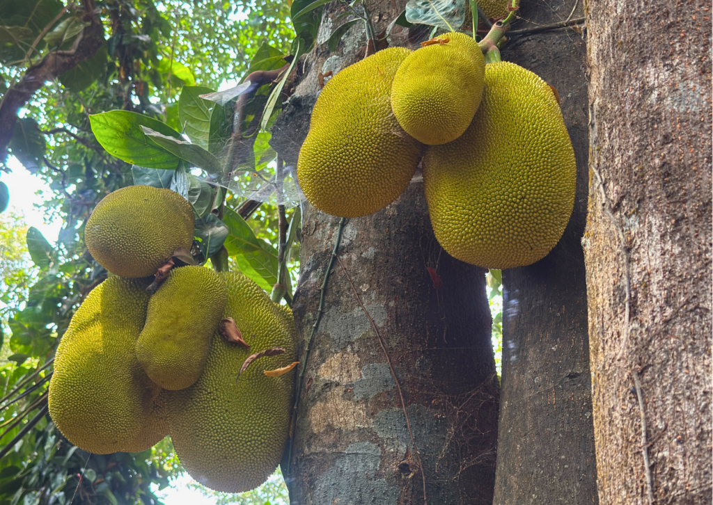 実は熟すと落下しますが、大きいものだと10キロ近くあり、頭の上に落ちてきたら…!とヒヤヒヤすると日本人の樺澤さんよりお伺いしました😊